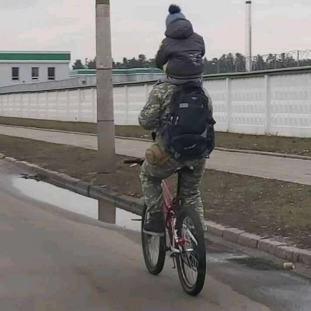 На снимках можно увидеть мужчину в камуфляже, на спине у него рюкзак, а на плечах сидит ребенок, которому на вид до 5 лет.