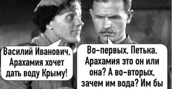 Мужчина выставил кадр из известного фильма, где идет диалог между двумя мужчинами. Один говорит: «Василий Иванович, Арахамия хочет дать воду Крыму», на что тот ему отвечает: «Во-первых, Петька, Арахамия это он или она? А во вторых, зачем им вода: Им бы водки».