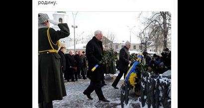Николай Азаров на своей странице разместил фото, на котором он пафосно возлагает цветы к памятнику в окружении почетного караула, а рядом с них Владимир Литвин. В посте он написал, что 15 февраля отмечается день чествования участников боевых действий на территории других государств. Далее он начал писать, что он склоняет голову перед теми, кто ее сложил.