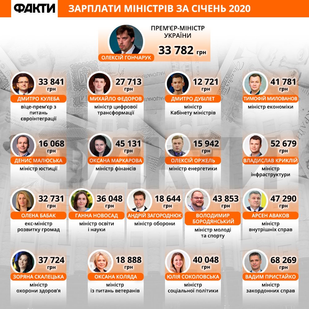 Так, зарплата министра иностранных дел Вадима Пристайко составляла 234 тыс. грн в месяц, министра соцполитики Юлии Соколовской – 217 тыс. грн.