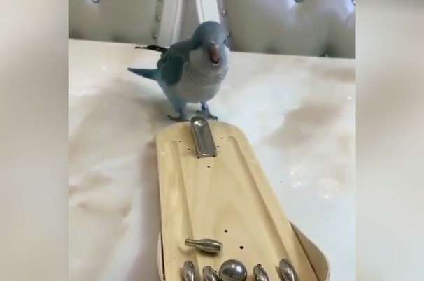 Дрессированный попугай научился играть в мини-боулинг и копить деньги