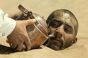Так, блогер Алексей Голобуцкий высмеял заявление Дениса Шмыгаля о том, что надо поставлять в Крым воду, по средствам кадра из советского фильма. На кадре изображен человек, по горло закопанный в песок, а ему из чайника дают попить воды.