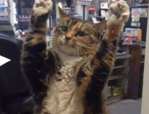 На видео можно заметить милого трехцветного кота с ошейником, который с невозмутимой мордочкой смотрит на руку хозяина. При этом хозяин сложил пальцы так, что ладонь стала похожа на пистолет. Через несколько секунд котик встает на задние лапки, а передние поднимает вверх так высоко, как только может.