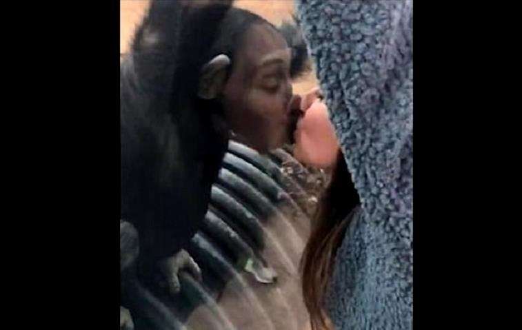 Шимпанзе поцеловал женщину в губы на глазах у ее мужа: забавное видео