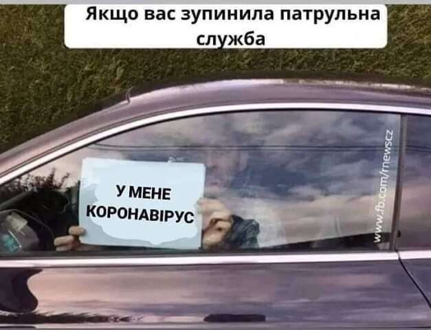 Автор другой картинки дает полезный совет водителям, которых во время карантина будет останавливать патрульная полиция. Ограничить общение с полицейскими он советует с помощью табличики «У меня коронавирус».