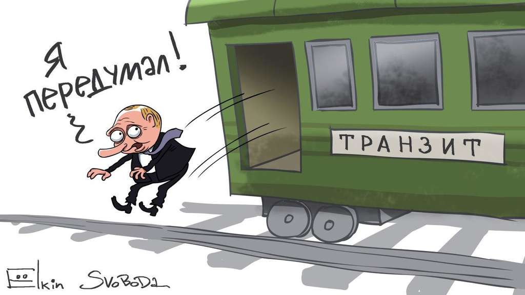 В своей работе художник показал Путина, которого выгоняют из поезда с табличкой «транзит». При этом российский президент говорит фразу «Я передумал».
