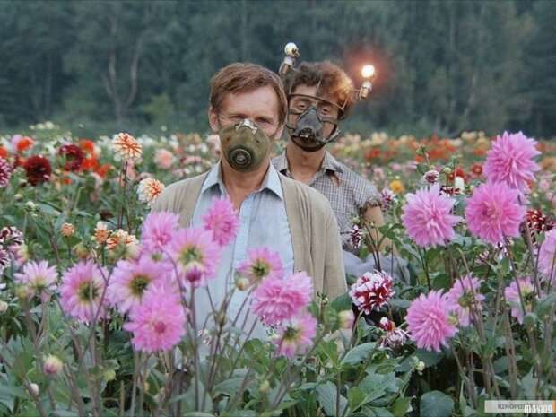 Отсутствие масок в аптеках Украины и лекарство от коронавируса во всем мире украинцы проиллюстрировали оригинальной фотожабой, а точнее стопкадром из фильма «Кин-дза-дза». На нем герои фильма стоят в цветнике из астр с зелеными респираторами на лицах и улыбаются.