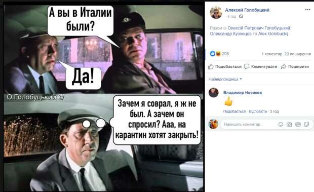 Так, политический эксперт и обозреватель Алексей Голубуцкий славится своими фотожабами в сети. Украинцы знают, что на его странице всегда есть оригинальные мемы и картинки на злобу дня. В очередной раз Голубуцкий не изменил своей привычке высмеять главную новость дня о карантине.
