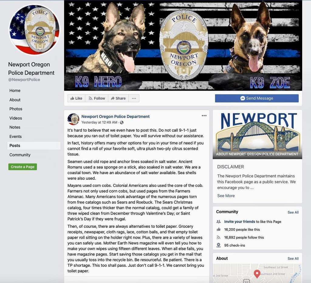 В США, куда коронавирус также добрался, полиция города Ньюпорт (штат Орегон) призвала жителей не звонить в «911», если у них закончилась туалетная бумага.