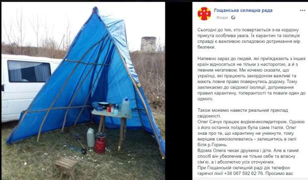 Житель Ровенской области показал, как нужно самоизолироваться после приезда из стран Европы, где сейчас бушует коронавирус. Олег Сачук недавно вернулся из Италии и поселился возле речки недалеко от родного села. О таком поступке местного жителя сообщили в Гощанской сельской раде.