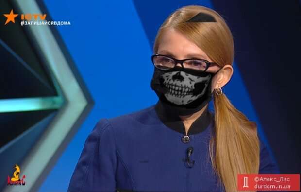 Отметим и другую группу людей, которые решили высмеять такое чувство стиля у бывшего премьер-министра. На сайте фотожаб появилась картинка, на которой при помощи фоторедактора Юлии Тимошенко на маске добавили принт в виде черепа. К слову, кадр был сделан на эфире «Свободы слова» на телевизионном канале ICTV. Автор поста подписал следующим образом: «Заразная, но в маске».