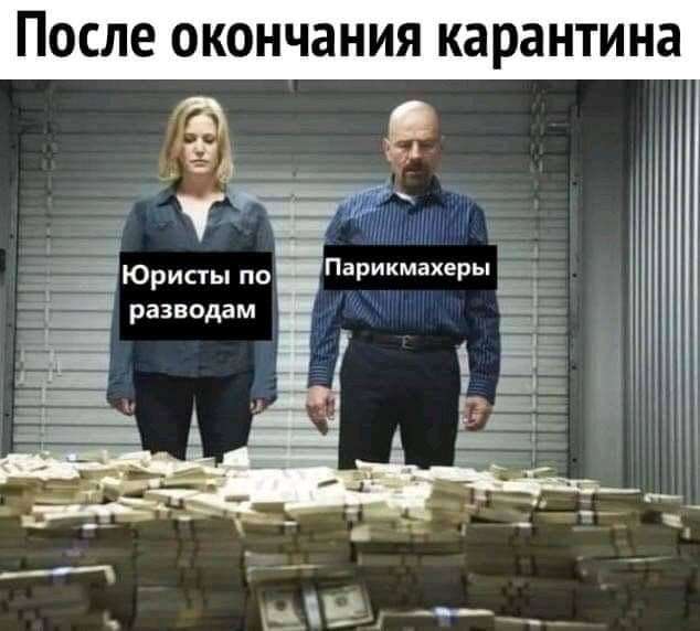 Автор картинки показал в своей работе юристов по разводам и парикмахеров, которые якобы после завершения карантина резко стали миллионерами. В фотожабе намекнули на то, что во время самоизоляции семейные пары могли часто ссориться, а также то, что в стране во время карантина не работают парикмахерские и салоны красоты.