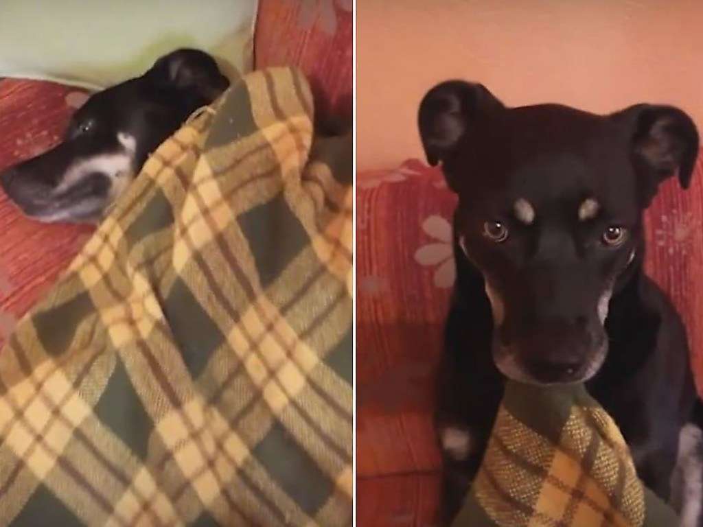 Отдых счастливого пса, который со всеми удобствами расположился на диване, был прерван хозяйкой, которая, стащив одеяло, инсценировала своё исчезновение.