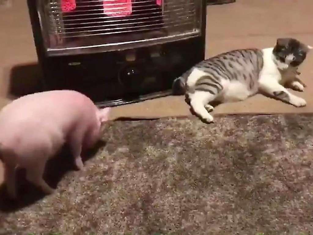 Владелица непримиримых домашних питомцев на днях запечатлела забавный инцидент из жизни кошки и поросёнка.