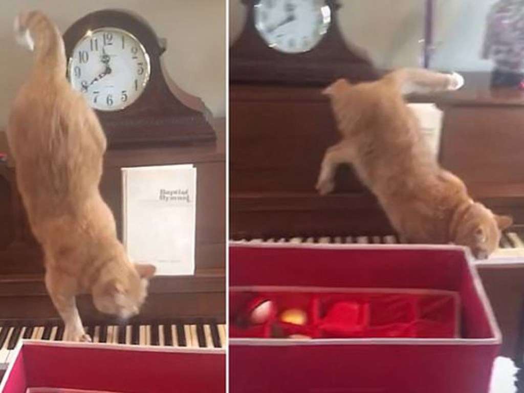 Жительница штата Огайо засняла на камеру своего рыжего кота, сидевшего на крышке пианино.