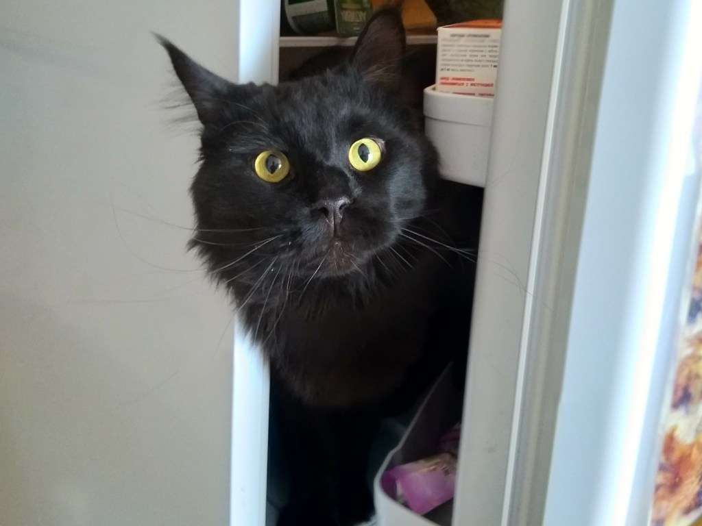 Кота придавило полкой с продуктами в холодильнике
