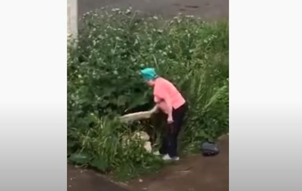 На кадрах ролика видно, как женщина бьет доской кого-то лежащего в кустах.