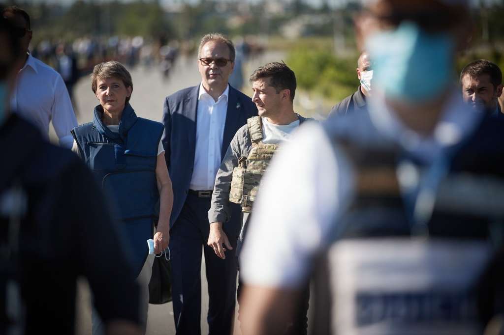 У межах поїздки на Донбас Президент України Володимир Зеленський і Президент Швейцарської Конфедерації Симонетта Соммаруга оглянули пішохідний міст через річку Сіверський Донець та ознайомилися з роботою контрольного пункту в’їзду/виїзду (КПВВ) «Станиця Луганська».
