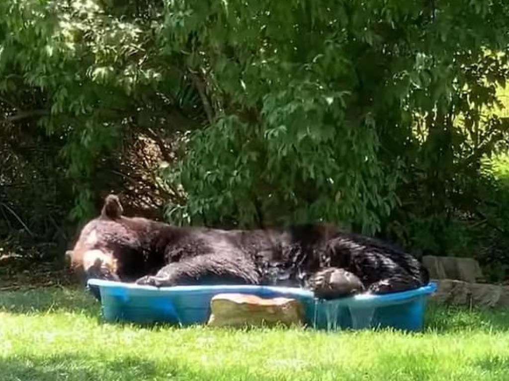 Женщина по имени Реджина Келлер засняла, как на ее заднем дворе в бассейне купается медведь. Она в этот момент поливала цветы, так как на улице было очень жарко. Животное некоторое время плескалось в воде, а после уснуло.