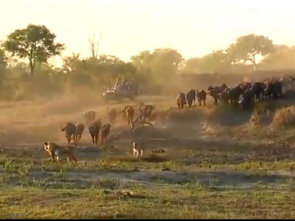 На записи видно, что два льва выбрались из зарослей и подбежали к буйволам, которые паслись на поляне. Из-за неожиданного появления хищников буйволам пришлось коллективно отступить. Однако после короткого тактического отхода представители семейства полорогих сплотились и пошли в атаку, в результате чего львы, поджав хвосты, кинулись наутек.