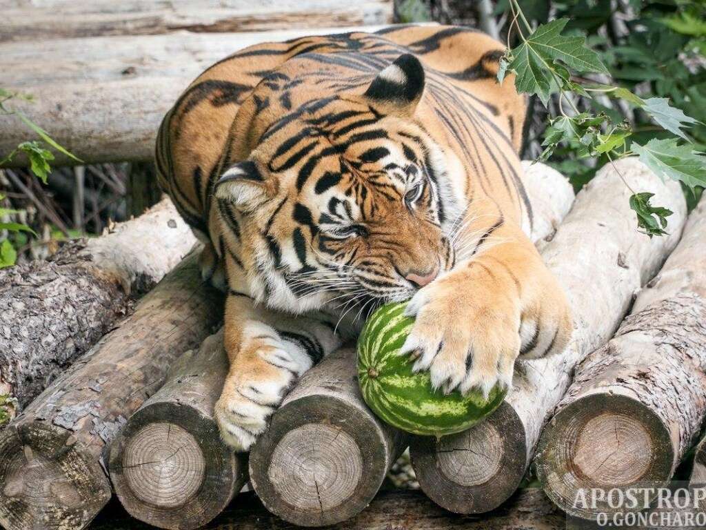 Забавнее всего себя повели себя тигры, которые порадовали посетителей различными трюками с арбузами: они их «футболили», грызли и явно получали удовольствие от процесса.