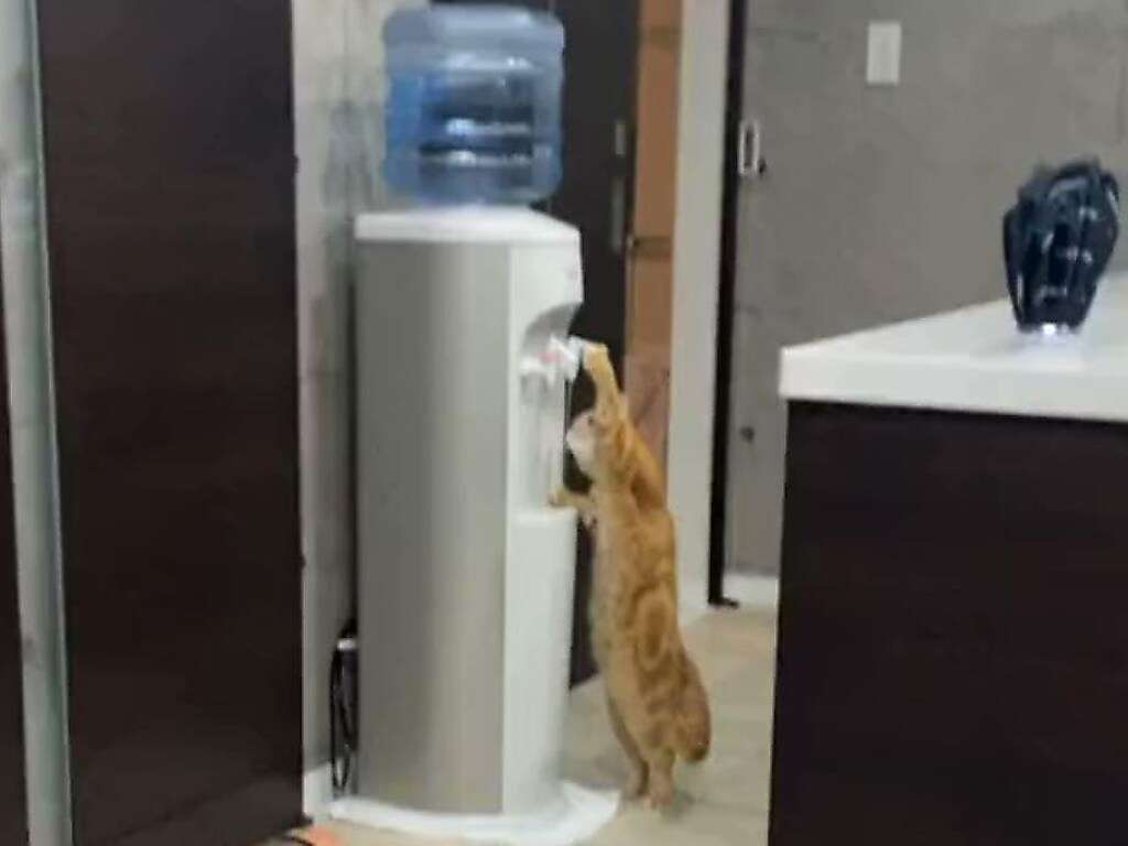 Рыжий котик, пьющий воду из кулера, был запечатлен на видео владельцем жилплощади, предположительно в США.