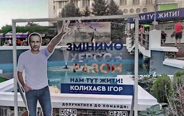 Кандидат в мэры Херсона, земельній магнат Игорь Колыхаев, заместитель председателя Комитета ВР по земле, установил в центре города свою фигуру для фотографирования с благодаргыми жителями. Кстати, его команда уже заказала фосковую фигуру Игоря Викторовича для установки в галерее мадам Тюссо первого украинца. Ну чисто тебе Пшонка, вы не находите.
