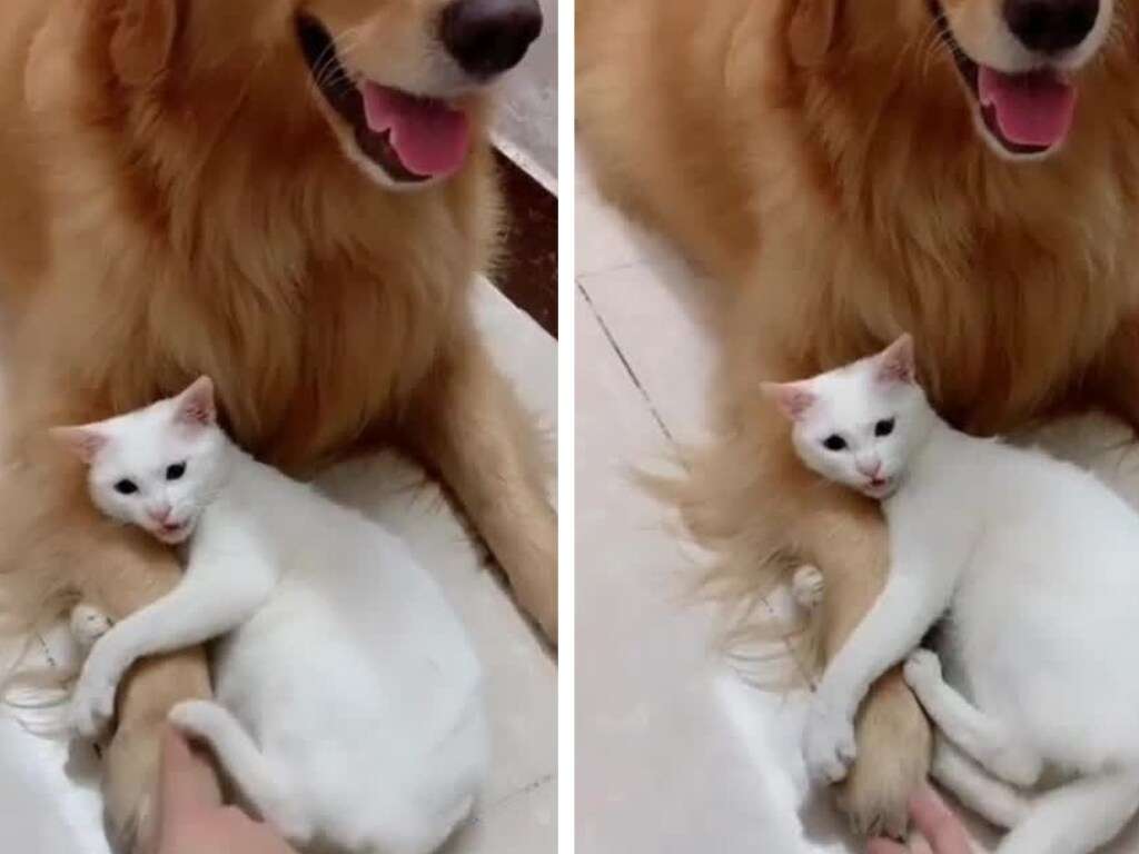 Отношения кошек и собак очень часто отличаются от широко известной фразы про этих двух животных. Живущие в одном доме питомцы в большинстве случаев становятся лучшими друзьями и партнерами по преступлениям. Котейка из этого вирусного ролика настолько обожает своего дружка-ретривера, что запрещает человеку к тому прикасаться.