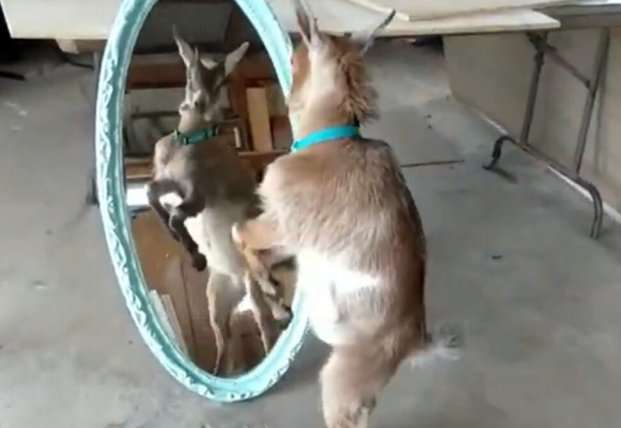В итоге хозяйке животного пришлось повесить зеркало на стену, чтобы козленок его не разбил.