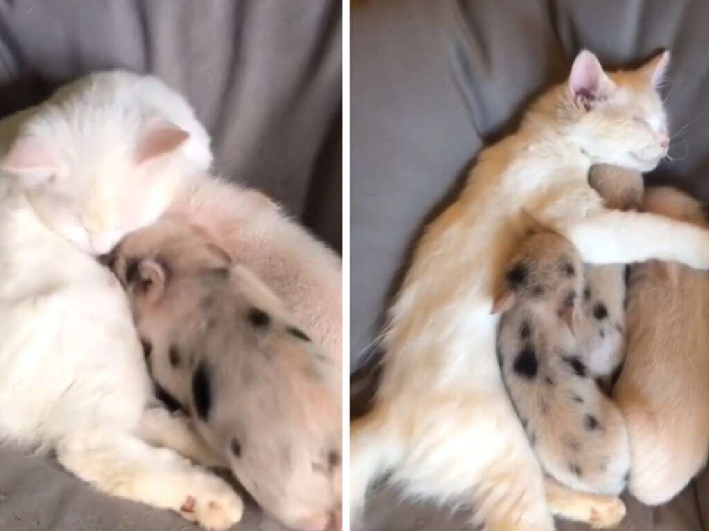 Так, кошка из данного вирусного видео также с радостью согласилась на роль приемной матери для трех очаровательных поросят. Взаимодействие пушистой кисы с малышами их хозяева засняли на видео.