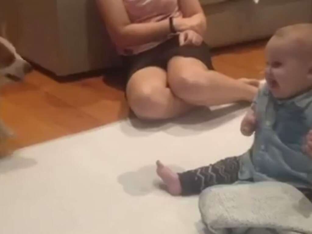 Родители запечатлели на видео своего маленького ребенка, который первый раз в жизни увидел щенка. Когда питомец стал гавкать и прыгать вокруг малыша, тот разразился звонким смехом.