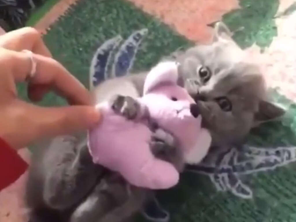 Не так-то просто заставить этого серого котенка расстаться с любимой игрушкой. Несмотря на юный возраст, он упрям, цепок и бесстрашен. Но одновременно очень потешен.