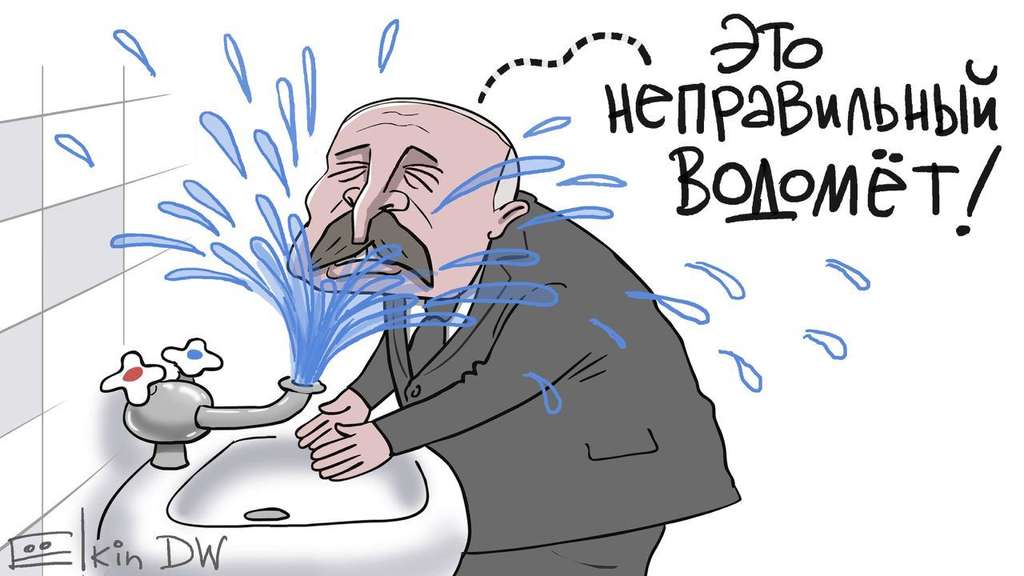 На карикатуре изобразили белорусского президента Александра Лукашенко, который сам пострадал от «водомета» в результате прорыва крана с водой.