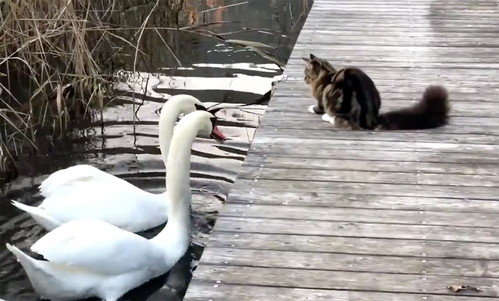 Так, маленький мейн-кун из Австрии впервые увидел лебедей и тут же решил познакомиться с ними поближе. Но питомец не ожидал, что эти грациозные белые птицы встретят его шипением. Однако котёнок не растерялся и смог за себя постоять.