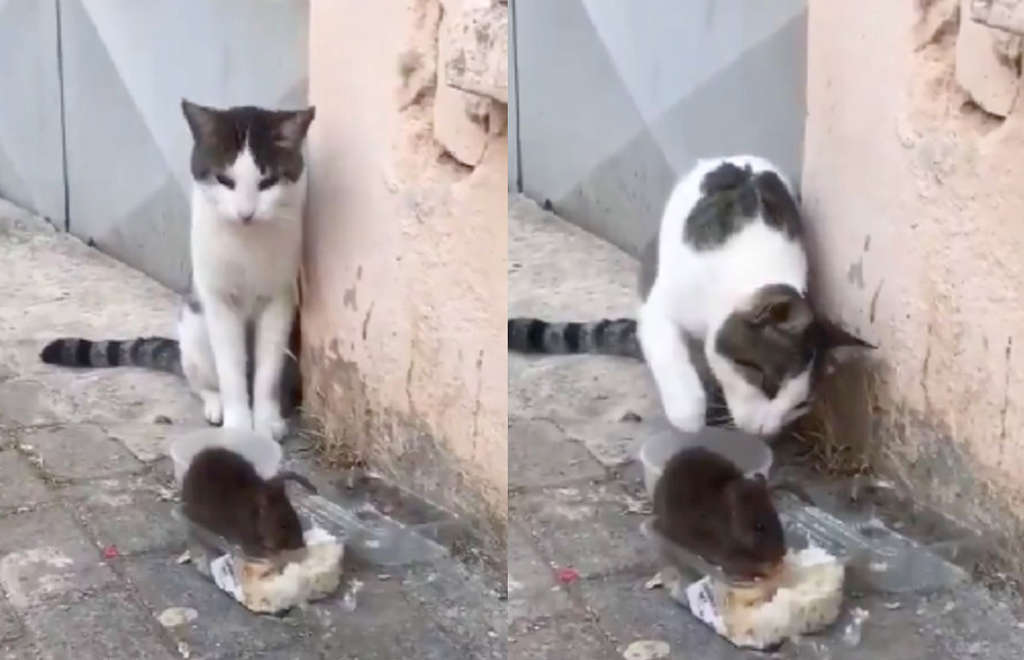 Сладко позевывая, кот подошел к своей миске с кормом. Видимо спросонья он не сразу заметил бойкую крысу, которая с аппетитом завтракала в отсутствие хозяина. Дальше произошло самое интересное.