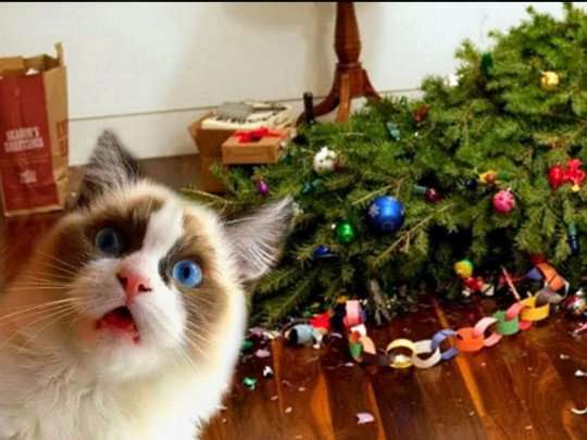 Многим людям известно, что новогодняя елочка на полу — вечный соблазн для котов из-за блестящей мишуры, игрушек и огней.