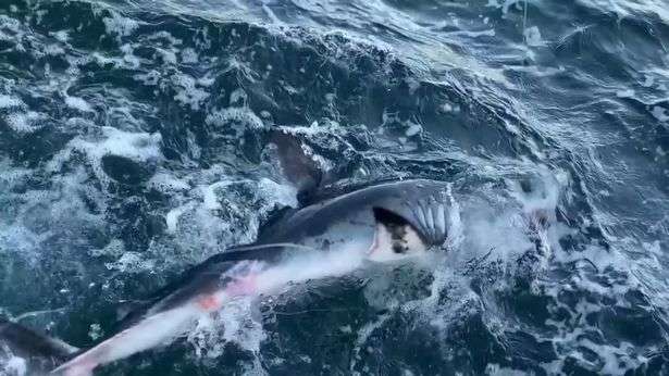 Огромная акула разорвала тунца, пока его поднимали на лодку