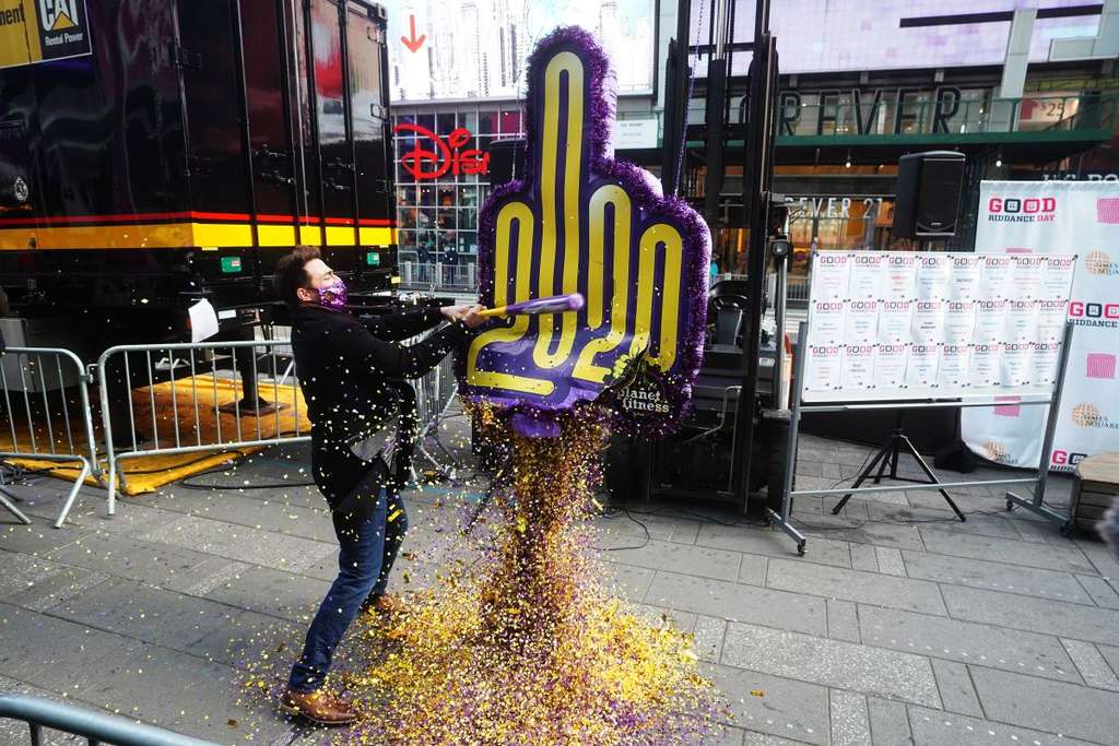 Кроме того, по традиции участники праздника разбивали пиньяту, наполненную мишурой и блестками. Эту традицию позаимствовали у мексиканцев. В этому году пиньята в Нью-Йорке была особенная — цифры 2020, но в форме неприличного жеста — среднего пальца. Вероятно, так сильно хотели «послать 2020-й куда подальше».