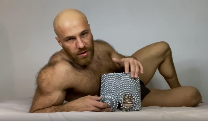 На записи бодибилдер в одних трусах ласкает серебряную маску необычной формы.