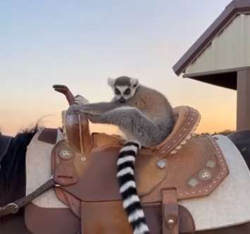 Судя по записи, лошади не очень нравится, что на спине у нее взгромоздились два диких зверя: она даже подрагивает, когда лемур вертится на седле.