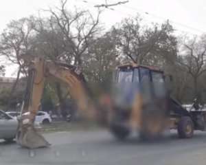В Одессе тракторист ехал, отталкиваясь ковшом от асфальта.