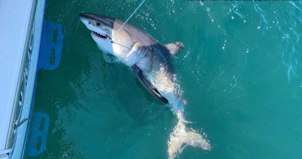 Американцы ловили лисьих акул в 1,5 км от берега. По словам капитана Джеффа Уорфорда, акула-людоед попалась на крючок случайно.