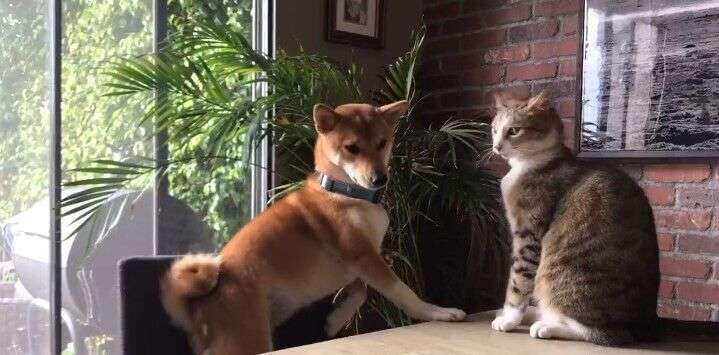 Ролик на своїй сторінці в Twitter опублікував американський журналіст Джефф Янг. У той момент, коли породистий пес намагається ніби вкусити кішку, вона вправно починає махати лапою, через що Айко зісковзує зі стільця.