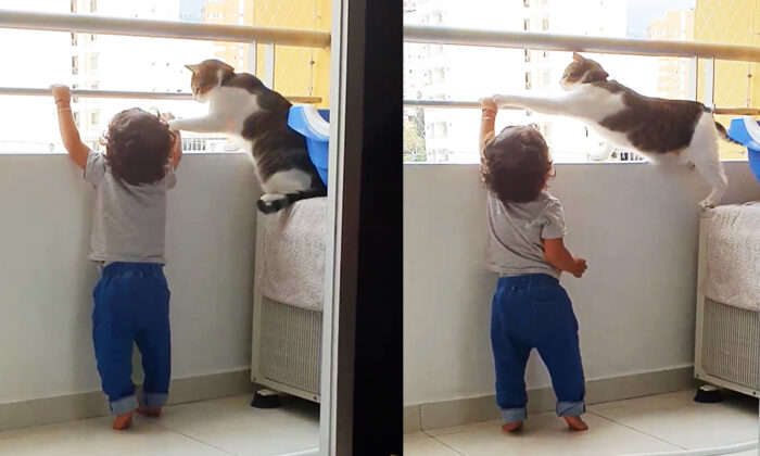 На кадрах, снятых одним из родителей, заботливый домашний кот проявляет альтруизм, когда маленький мальчик её хозяев рискованно тянется к перилам балкона их многоэтажной квартиры.