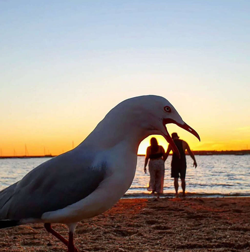 Пара рассчитывала получить милое видео, которыми можно будет поделиться на Facebook, но вместо этого обнаружила курьезную «фотобомбу» от чайки. Оказалось, что пока они позировали у воды, чайка полностью захватила кадр.