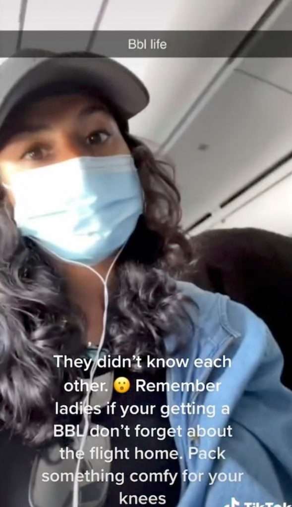 Автор видео и фото, Андреа, написала на TIkTok: «Итак, я села сегодня на рейс, и все женщины вокруг меня только что перенесли операцию по увеличению ягодиц. До полета они не были знакомы. Помните, дамы, если вам делают бразильскую подтяжку ягодиц, не забывайте о рейсе домой. Возьмите с собой что-нибудь удобное для колен».
