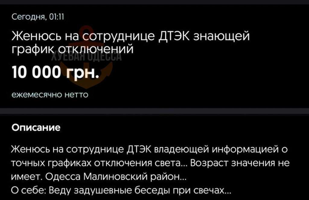 “Одружуся зі співробітницею ДТЕК, яка знає графіки відключень”, – з таких слів починається оголошення. За таку інформацію одесит готовий навіть платити 10 тисяч гривень на місяць!