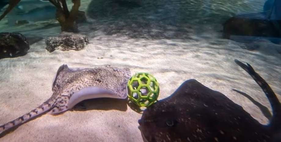 Співробітники Лондонського акваріума поділилися чарівним відео — на кадрах видно, як скати грають у м’яч під водою. Експерти запевняють, що підводний футбол сприяє розумовій стимуляції у променях сонця. Цікаво, що як м’яч для футболу скатів використовується м’яч у вигляді сітки, всередині якої розташована їжа.