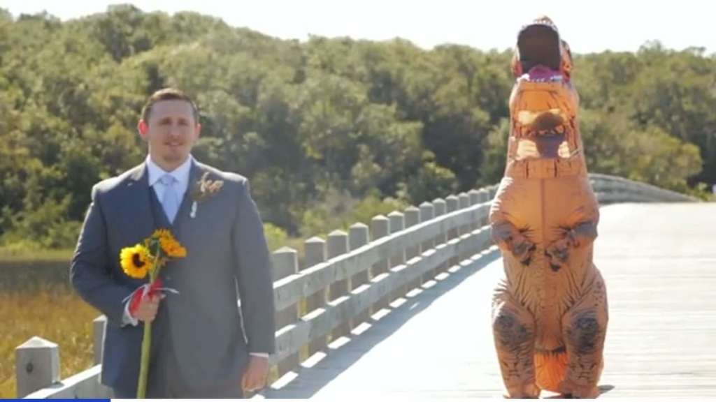 Американка прийшла на весілля у костюмі динозавра (ВІДЕО)