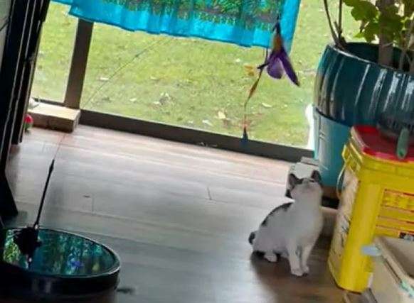 На допомогу прийшов домашній робот-пилосос з прикріпленою до нього іграшкою.